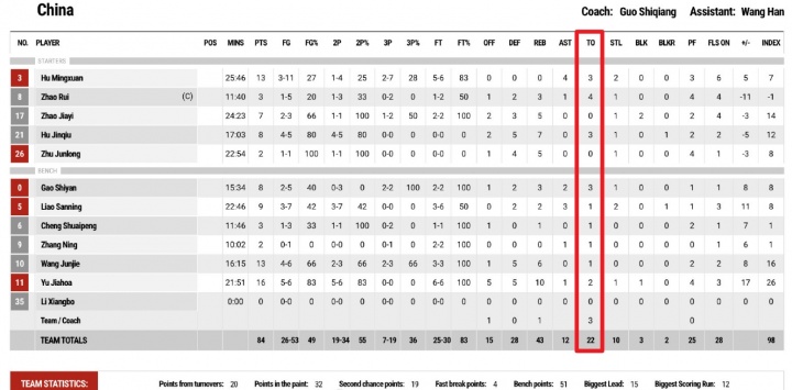 官方公布了本场比赛的数据,中国男篮全队共出现了多达22次的失误,球员数据如下: