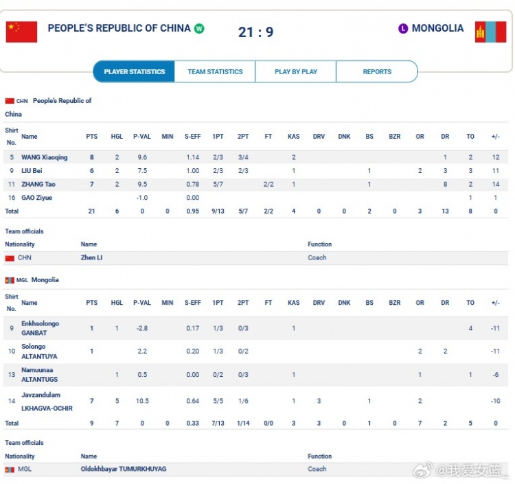中国21-9蒙古,王小青8分,张涛7分,刘贝6分,蒙古队雅夫赞杜勒姆-勒赫格瓦-奥其尔空砍7分。