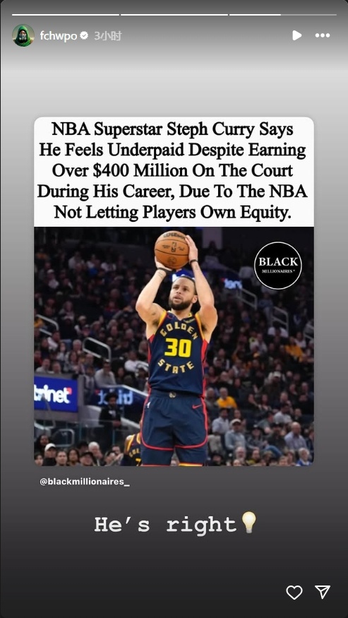 库里表示,尽管他在职业生涯中球场收入已超过4亿美元,但由于NBA不允许球员持有股权,让他觉得自己薪酬偏低。
