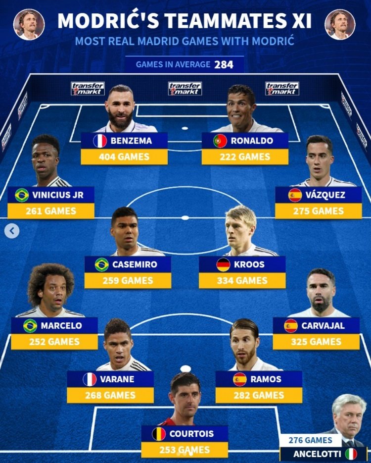 7月11日讯 皇马在世俱杯半决赛0-4惨败巴黎,莫德里奇已经完成告别战。《转会市场》也列出了莫德里奇皇马生涯并肩作战次数最多的队友阵容。