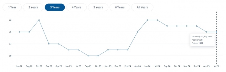 在最新公布的一期国际足联排名中,俄罗斯位居世界第35位,名列欧足联前20。总体排名相较3年前被禁赛时处于同一水平线。