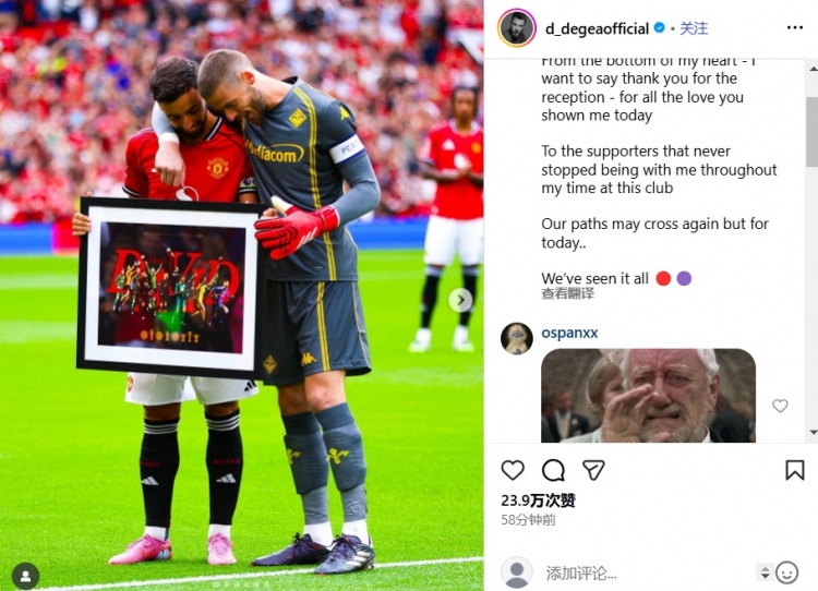 在社交媒体上,德赫亚写道:对于我和我的家人而言,重返老特拉福德是一个神奇的时刻,这里是我的家。我打心底想说感谢你们今天的欢迎,感谢你们今天向我展示出的所有的爱!