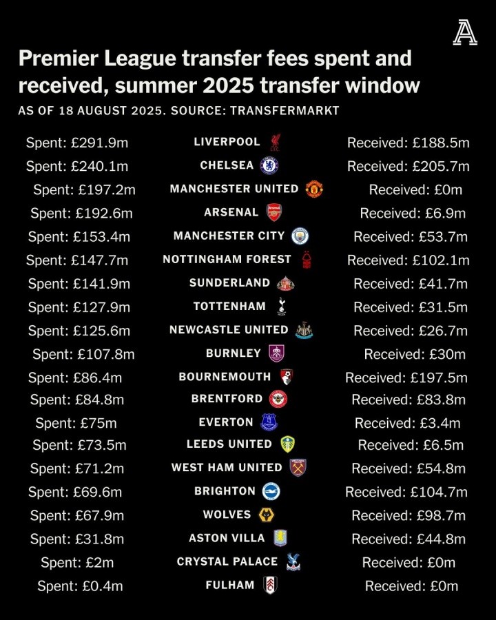 英超20队夏窗收支榜:曼联净支出1.97亿最多 伯恩茅斯净赚1亿多