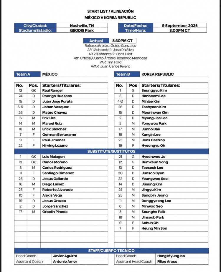 9月10日讯 北京时间今天9点30分,墨西哥将在友谊赛中对阵韩国,两队首发名单出炉。